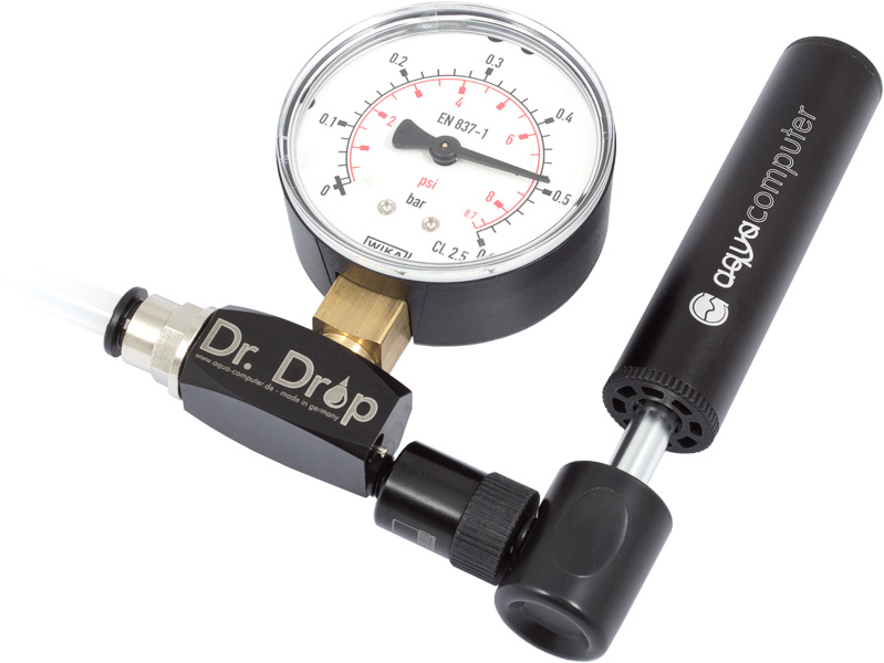 Dr. Drop wird bei uns im Werk aus Delrin CNC gefertigt. Die Ventile sind ebenfalls aus deutscher Herstellung, das Manometer stammt von Wika. Wir haben also alles getan damit man lange und zuverlässig mit dem System prüfen kann. Als Anschlussgewinde zum System wird G1/4" verwendet. Wir bieten Dr. Drop mit und ohne Luftpumpe an.